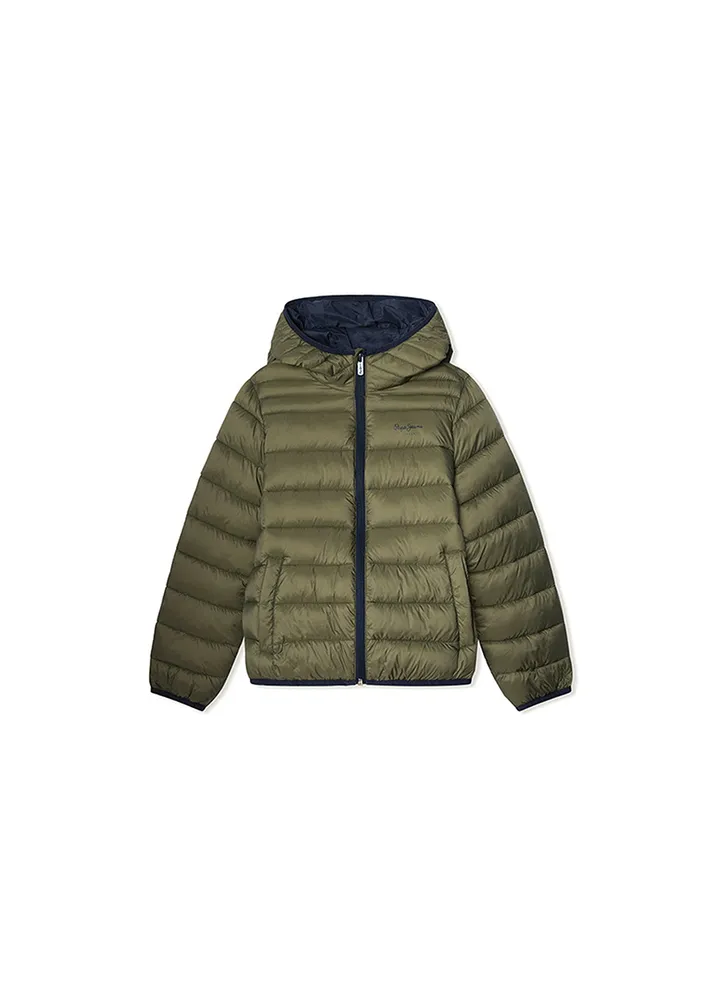 Waterproof, puffer, short jacket featuring horizontal padded panels, a fixed hood with elastic edge, front zip closure, piped side pockets, a PEPE JEANS logo on the left chest, contrast-colored interior lining, and elasticated cuffs and hem.