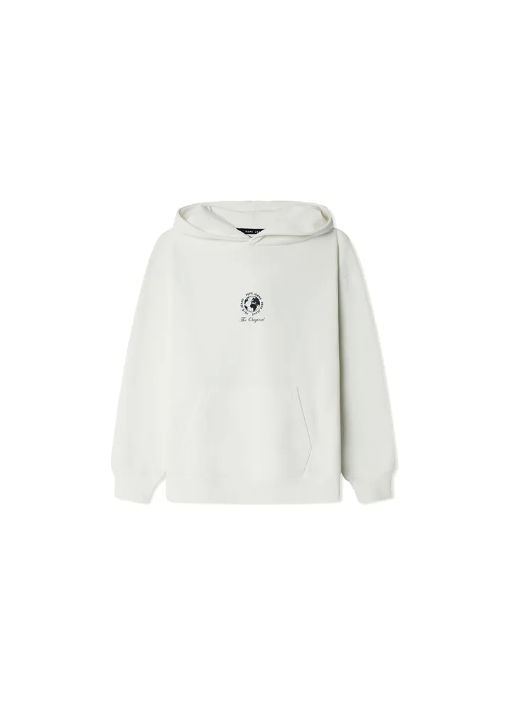 Long sleeve, crew neck, relaxed fit, cotton fleece sweatshirt featuring a fixed hood with central seam, PEPE JEANS logo and earth planet prints on the chest and back, a kangaroo pocket, ribbed cuffs and hem, and an inner neck band with logo detailing.