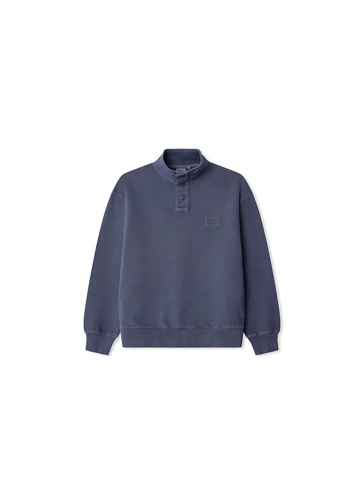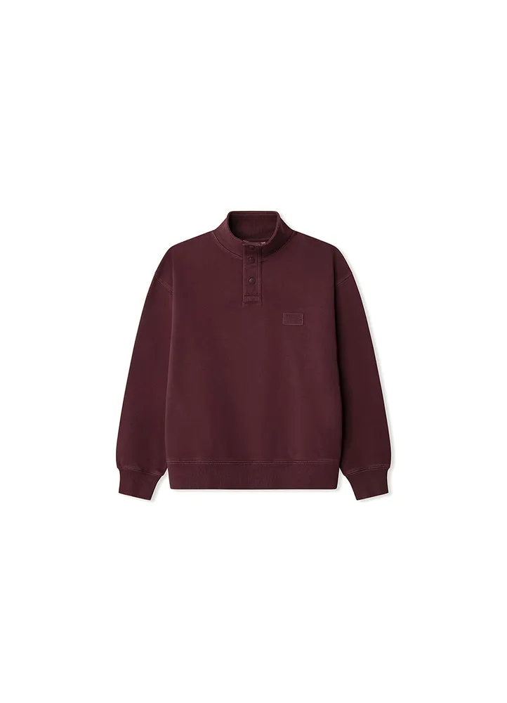 Long sleeve, high neck, relaxed fit sweatshirt with three snap buttons placket, and a brand label on chest.