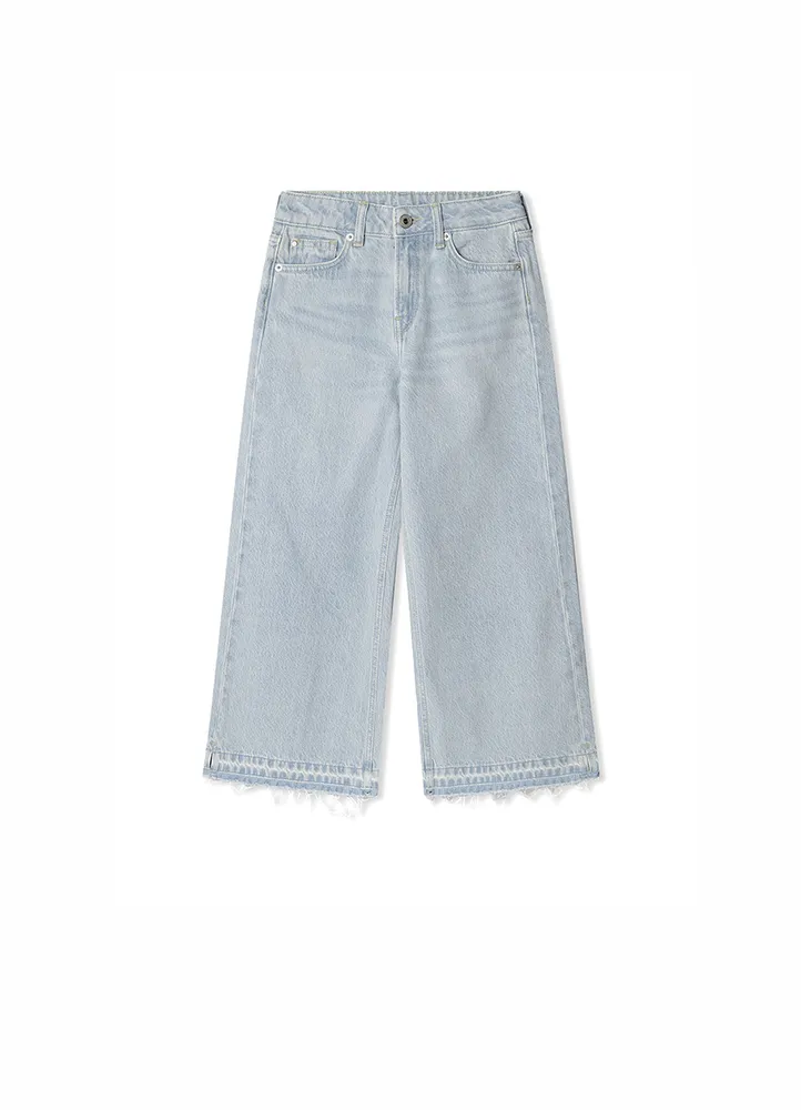 Wide fit, high waist, wide leg jeans featuring a classic 5-pocket style, zip and button fastening, stitching detail on the back pockets, an adjustable elastic waistband for comfort, a raw hem with frayed edges, and a signature PEPE JEANS metal plaque on the back pocket.