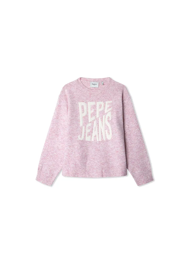 Printed Sweater. Long sleeve, crew neck, wide fit sweater featuring a ribbed detailing on the neck, cuffs, and hem, a maxi jacquard PEPE JEANS logo on the front, and a jacquard star on the right sleeve. 73% Polyester, 10% Nylon, 10% Acrylic, 4% Wool, 3% Elastane.