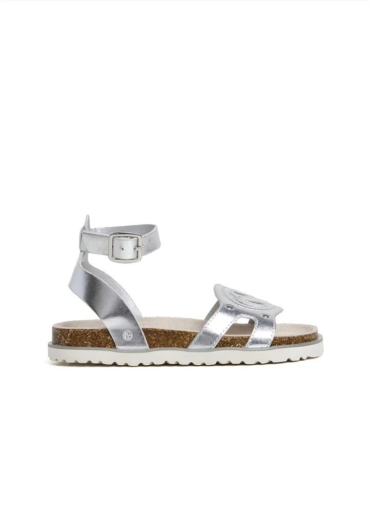 Sandals featuring an ankle adhesive strap fastening, a “P” monogram logo on the vamp with studs, a natural cork midsole with an extra light EVA sole, and a metallic “P” monogram pin on the lateral side.