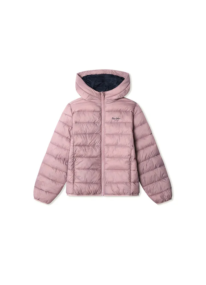 Waterproof, puffer, short jacket featuring horizontal padded panels, a fixed hood, front zip fastening, hidden side pockets with zip closure, elastic cuffs and hem, a PEPE JEANS logo printed on the left chest, and a color contrast interior lining.