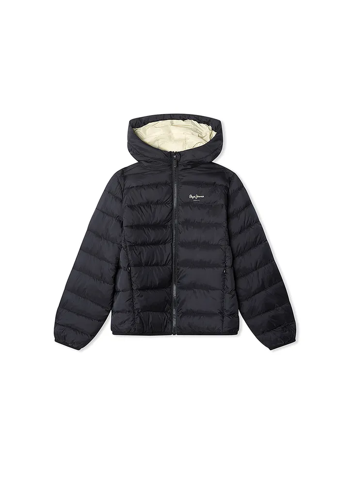 Waterproof, puffer, short jacket featuring horizontal padded panels, a fixed hood, front zip fastening, hidden side pockets with zip closure, elastic cuffs and hem, a PEPE JEANS logo printed on the left chest, and a color contrast interior lining.