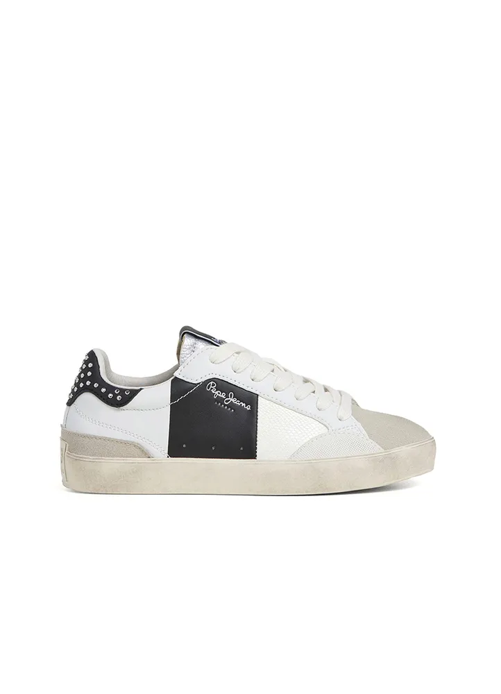 Studded Classic Sneakers. Classic faux leather sneakers featuring lace-up fastening, a metallic tongue with PEPE JEANS label, contrast side bands, heat-sealed logos, decorative metal studs on the heel, a removable thermoformed foam insole, a worn effect on the sole edge, and a durable rubber cup sole. 100% Polyurethane.