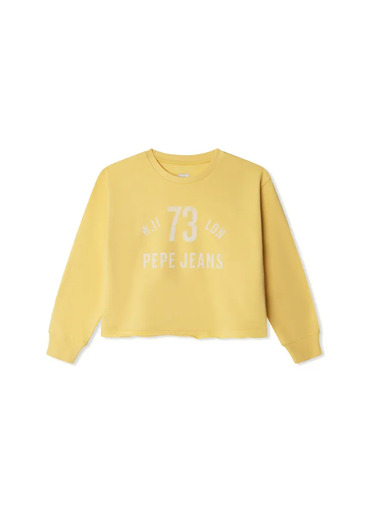 Long sleeve, crew neck, soft and lightweight sweatshirt with a slightly dropped shoulders, worn-effect PEPE JEANS front logo, raw frayed hem, and ribbed detailing on the neck and cuffs.