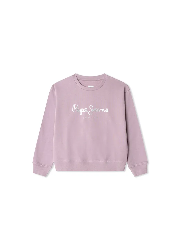 Logo Print Sweatshirt. Long sleeve, crew neck, relaxed fit sweatshirt featuring a ribbed detailing on the neck, cuffs, and hem, and a metallic effect PEPE JEANS logo printed on the front. 100% Cotton.