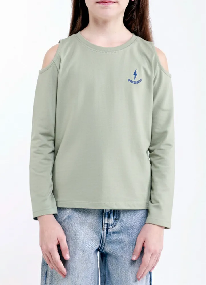 Open Shoulders T-Shirt. Long sleeve, crew neck t-shirt with open shoulders, and embroidered lightning bolt and PEPE JEANS logo on the chest. 100% Cotton.