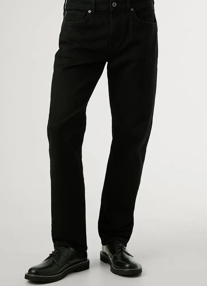 Straight Fit Jeans. Straight fit, regular waist, straight leg jeans crafted from flexible stretch denim in a medium blue enzyme wash, featuring a 5-pocket zip fastening, contrast stitching, detailed back pockets, and a leather PEPE JEANS logo patch on the rear waistband. 98% Cotton, 2% Elastane. |