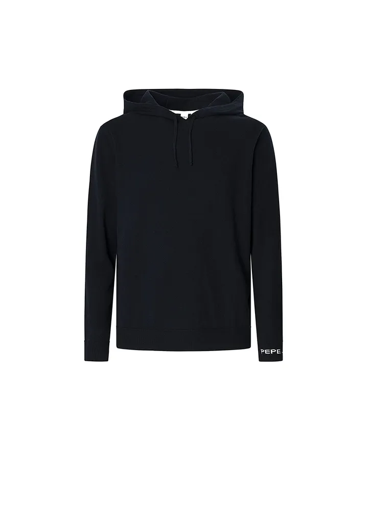Logo Print Hooded Sweater. Long sleeve, crew neck, cotton, wool, and cashmere sweater featuring a solid color an adjustable drawstring hood, ribbed cuffs and hem, contrast detail inside the collar, jacquard PEPE JEANS logo on the left cuff, and a logo label inserted in the side seam. 94% Cotton, 3% Wool, 3% Cashmere. |