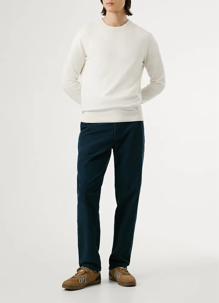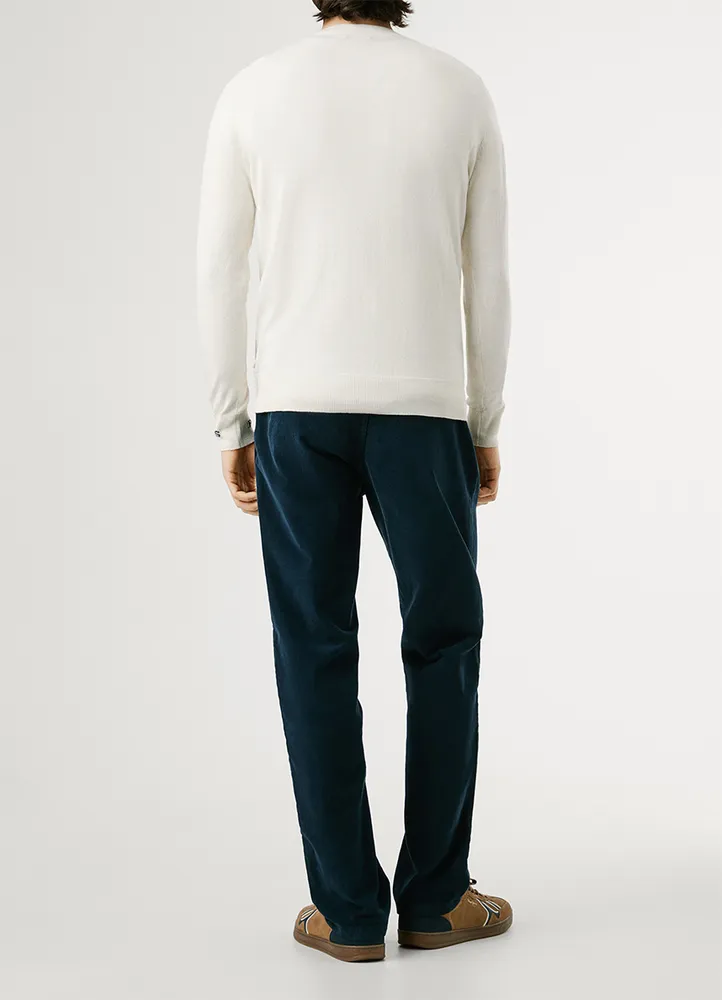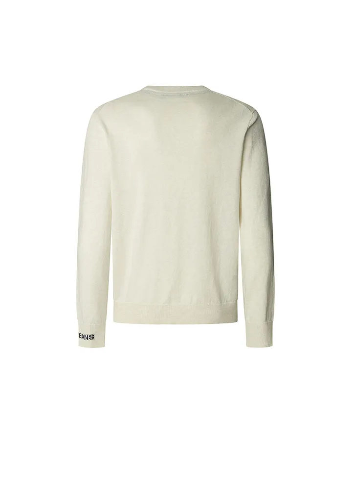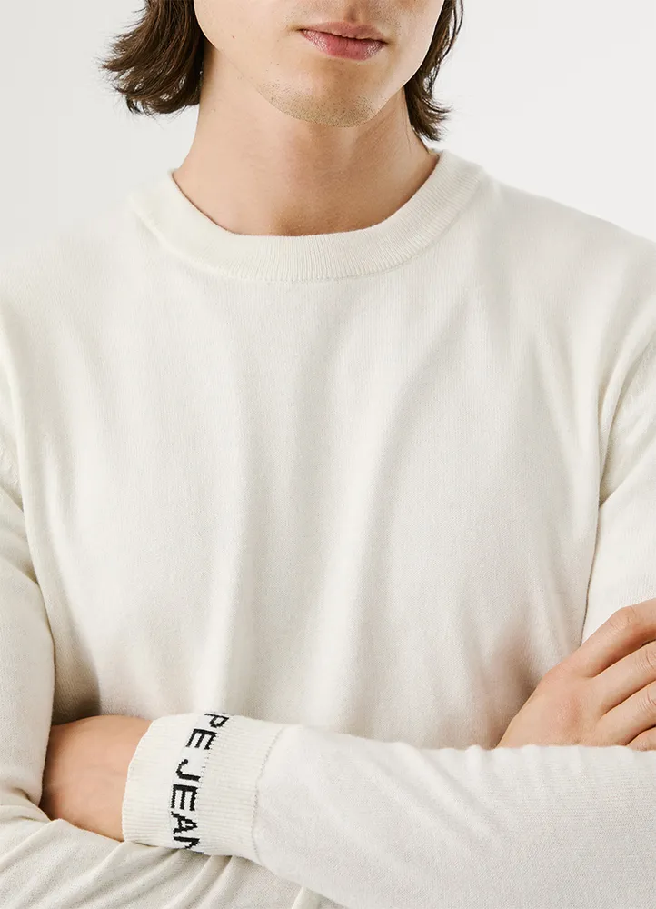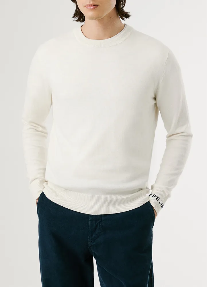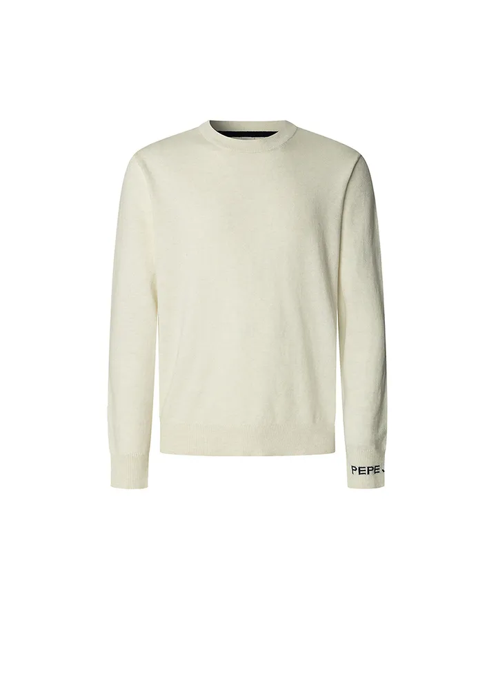 Long sleeve, crew neck, regular fit sweater featuring a ribbed detailing at the neck, cuffs, and hem, a contrast color inside the collar, jacquard PEPE JEANS logo on the left sleeve, and a logo label inserted in the side seam.