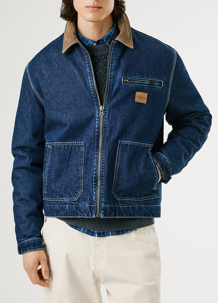 Relaxed fit, rigid denim, short jacket with a contrasting corduroy shirt collar, front zip fastening, zipped chest pocket, two side patch pockets, dark denim wash, adjustable buttoned hem, and a leather PEPE JEANS logo patch on the chest.