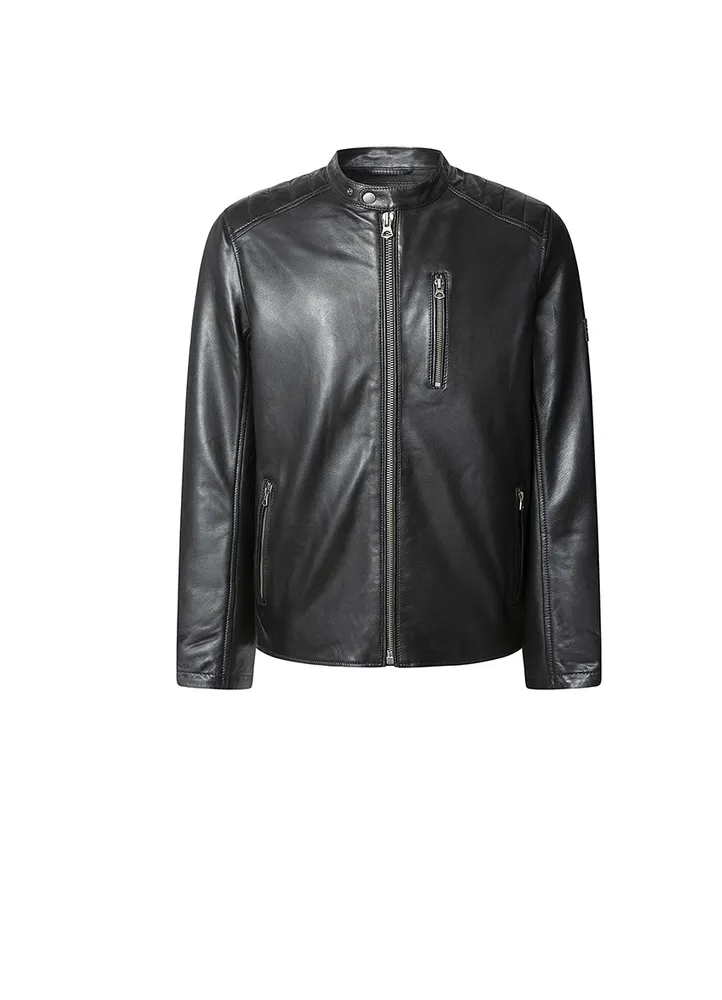 Leather Biker Jacket. Leather biker jacket featuring a snap-fastened collar, quilted shoulder pads, zip fastenings at the pockets and center front, an embroidered flag patch on the sleeve, branded trims, and an additional chest pocket. 100% Lamb Leather. |