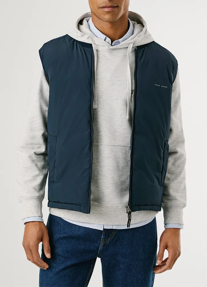Mix Fabric Vest. Regular fit vest featuring a padded front panel, bomber collar with ribbed detail, front zip fastening with a custom logo pull, piped side pockets, a knit fabric back, and a printed PEPE JEANS logo on the left chest. 50% Cotton, 50% Polyester.