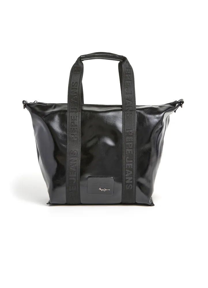 Faux leather effect bowling bag featuring a zippered single compartment, short canvas handles with an ergonomic grip and uppercase logo, an adjustable and removable shoulder strap, a front patch with PEPE JEANS metal plaque, and a lined interior with a zip pocket.