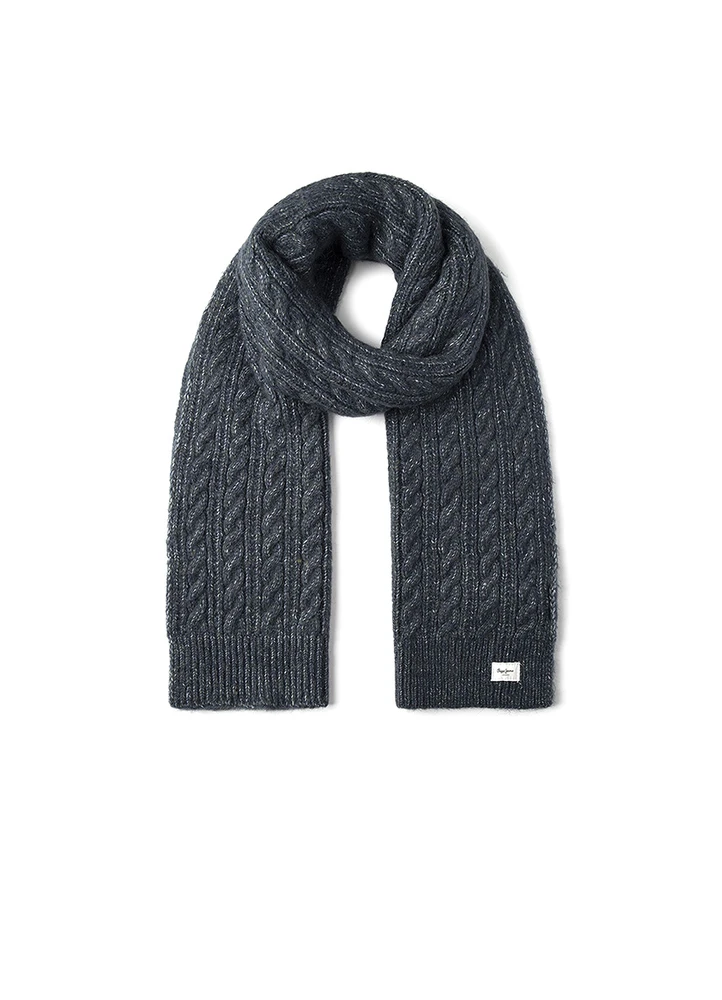 Knitted scarf with a cable knit design, finished edges, ribbed ends, and a PEPE JEANS logo label sewn on the edge.