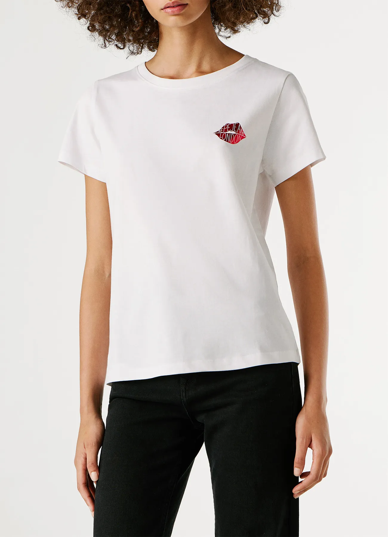 The solid color design is accented by a subtle lip graphic printed on the left chest, adding a playful touch to your everyday style.