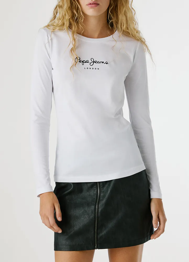 Long sleeve, crew neck, slim fit Lycra cotton t-shirt featuring a ribbed crew neck, a printed PEPE JEANS logo on the front, and double stitching on the sleeves and hem.