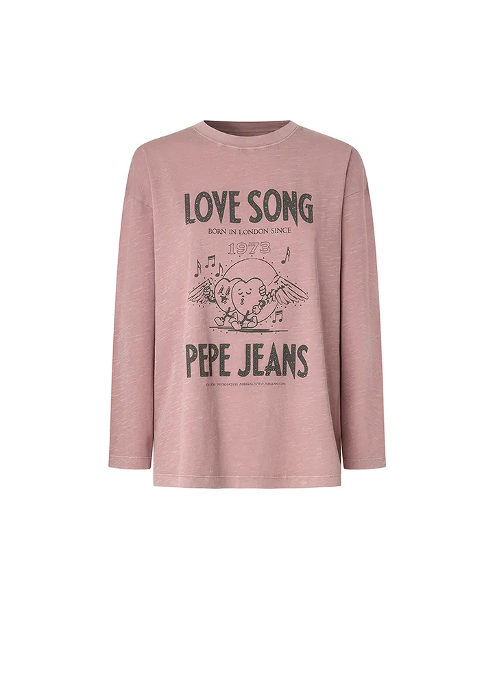 Long sleeve, crew neck t-shirt with “Love Song Pepe Jeans” text with strass and hearts with wings printed on the front.