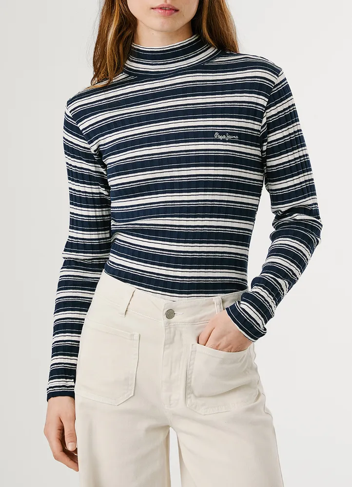 Long sleeve, turtle neck, ribbed t-shirt featuring a an all-over lurex and multicolor striped print, an embroidered PEPE JEANS logo on the left chest, and double stitching on the sleeves and hem.