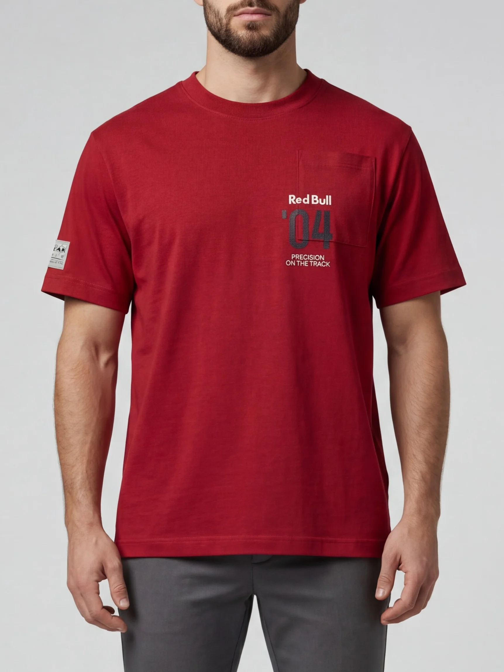 Show your sporty side with this Red Bull Racing short-sleeve crew neck T-shirt. Features a chest pocket and bold “Red Bull 04” text on the front for a stylish, team-inspired look.