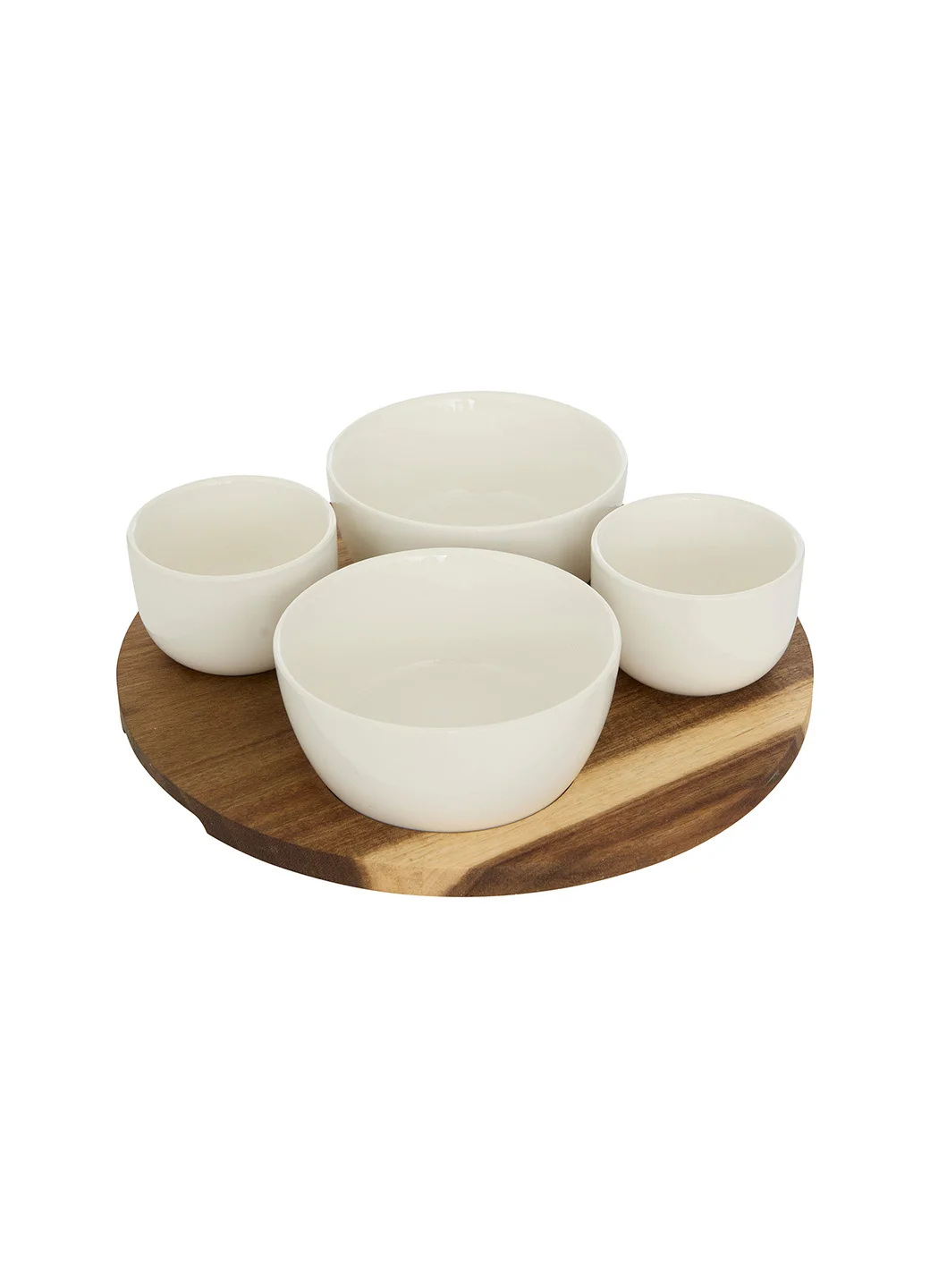 APPETIZER SET ELEGANCE 5 PIECES, 1 ACACIA WOOD TRAY WITH 4 PORCELAIN BOWLS, TRAY DIA: 26 CM