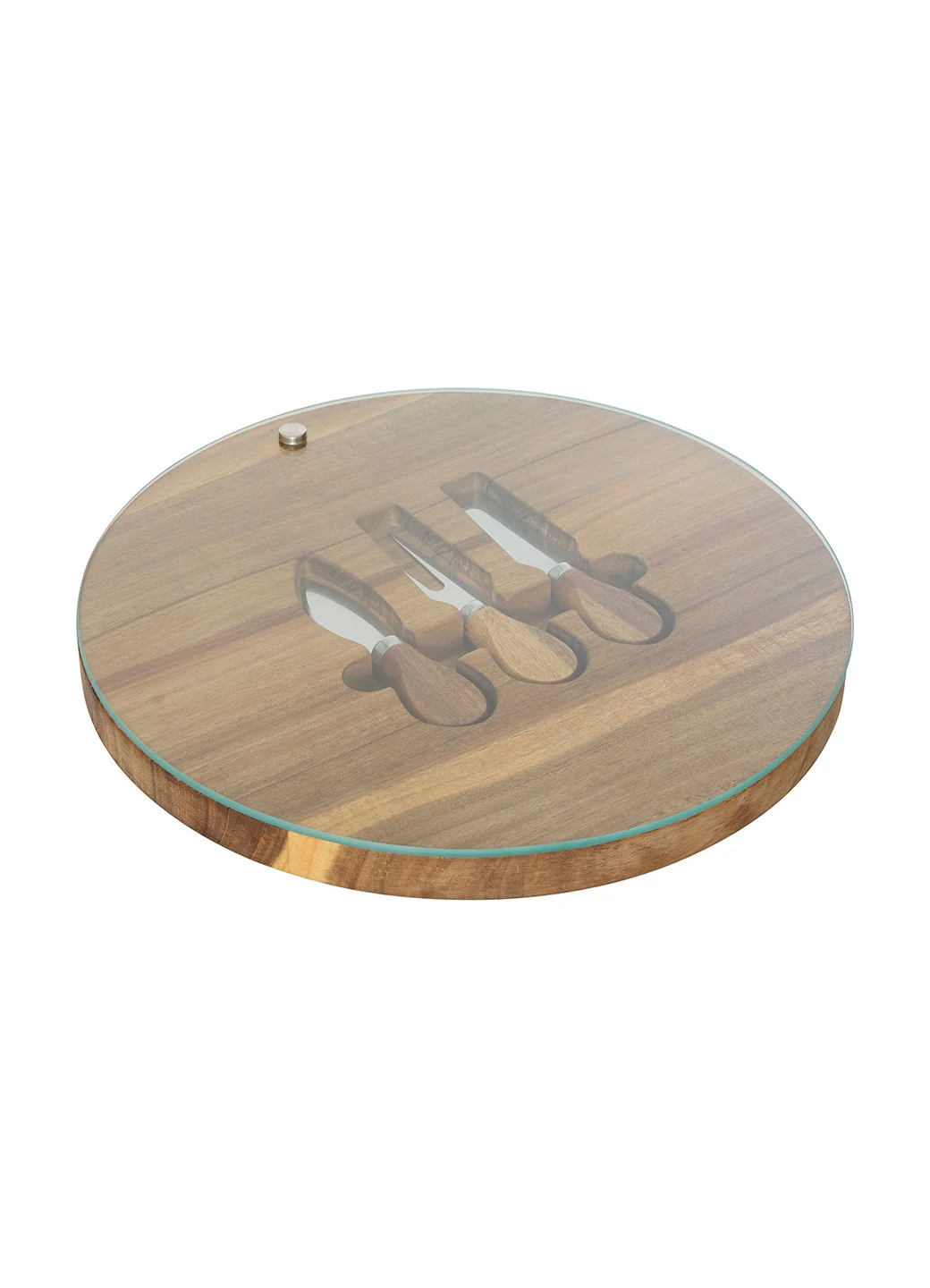CHEESE BOARD MINA, ACACIA WOOD BASE WITH GLASS TOP, AND 3 CHEESE KNIVES, DIA: 30 CM