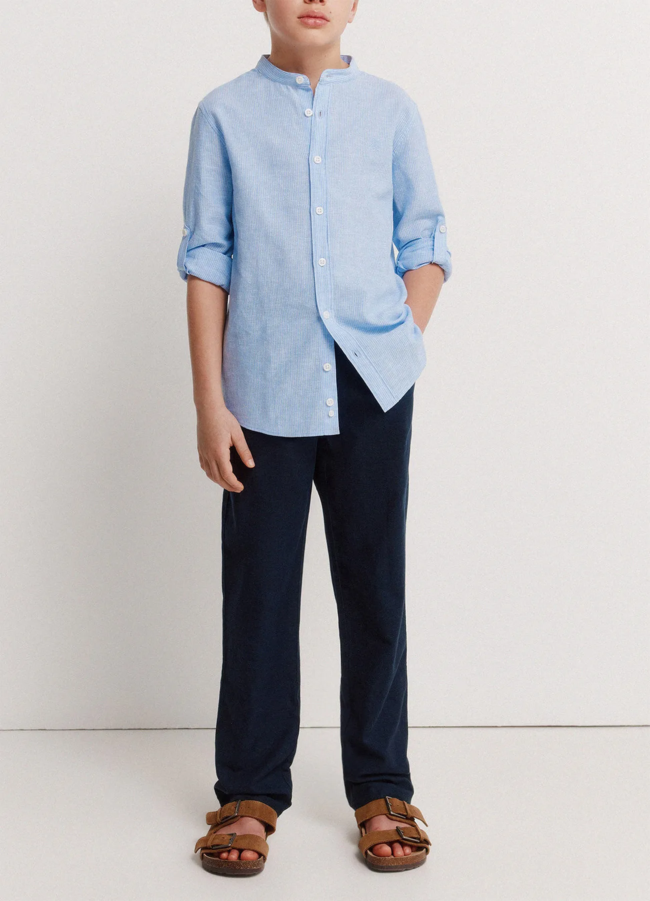 Long sleeve, Mao collar, regular fit, linen, striped shirt with embroidered Springfield logo on the chest.