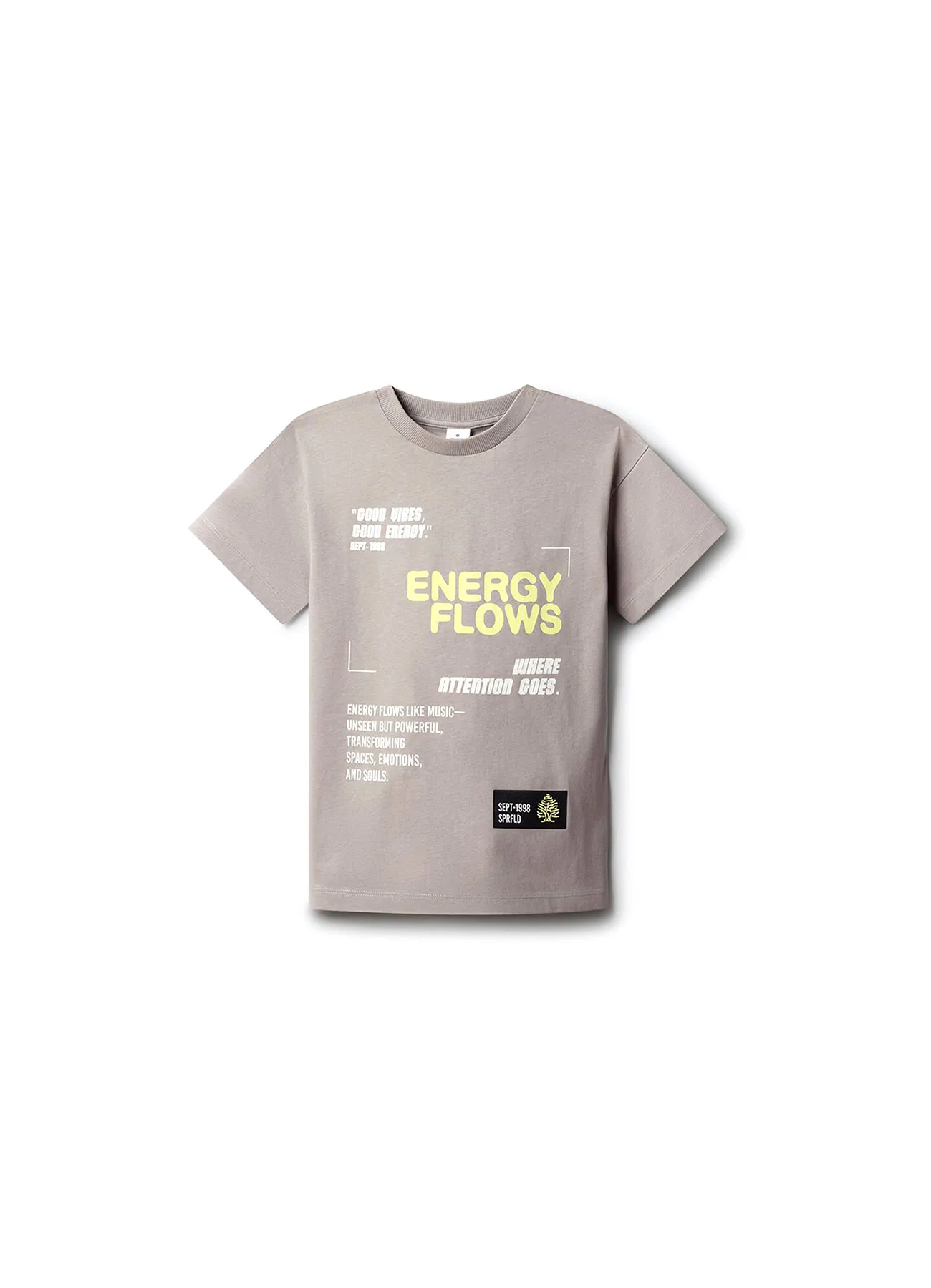 Short sleeve, crew neck t-shirt with “Energy Flows” text on the front.