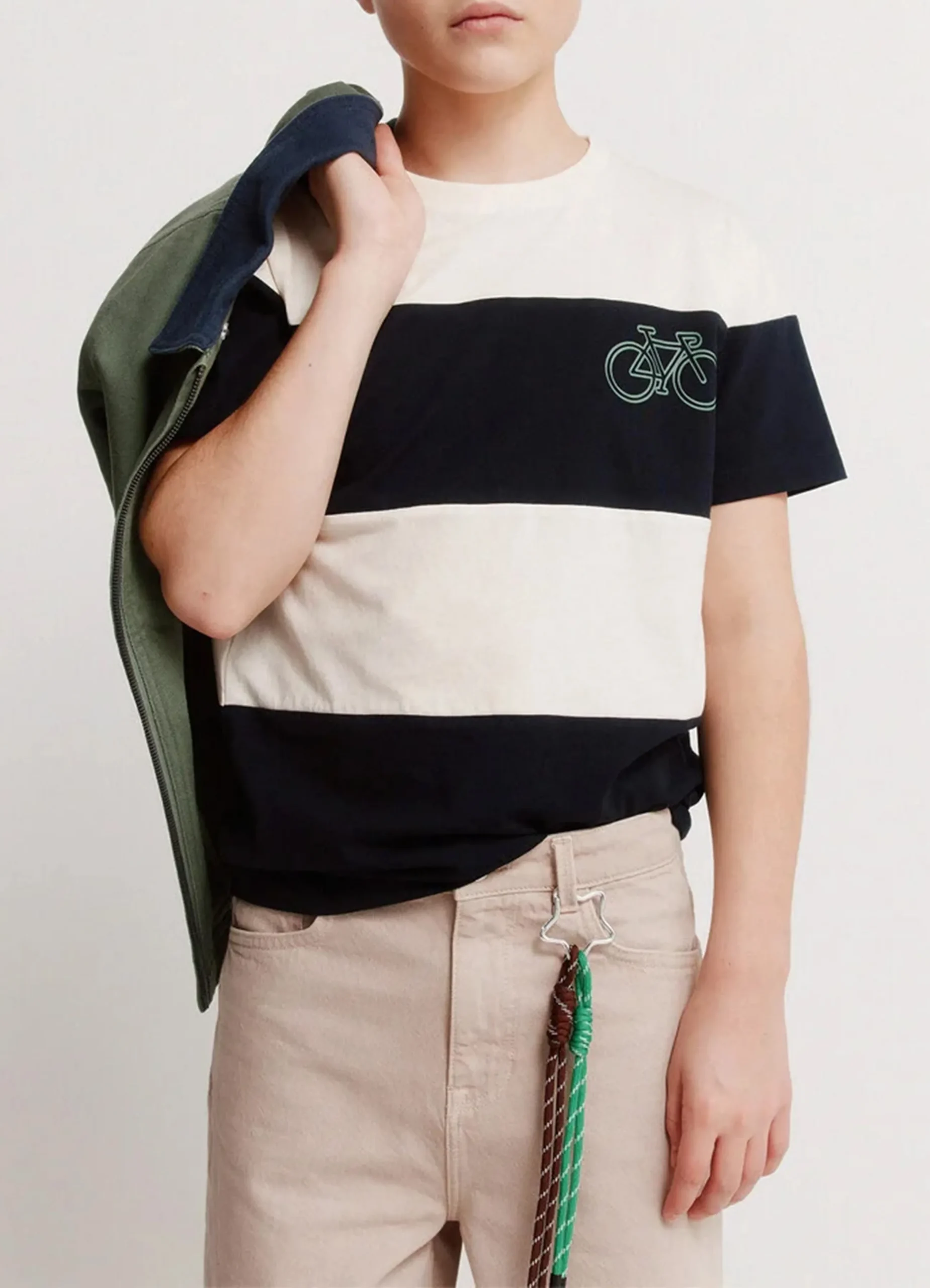 Short sleeve, crew neck t-shirt with four color blocks, and a bicycle on the chest.