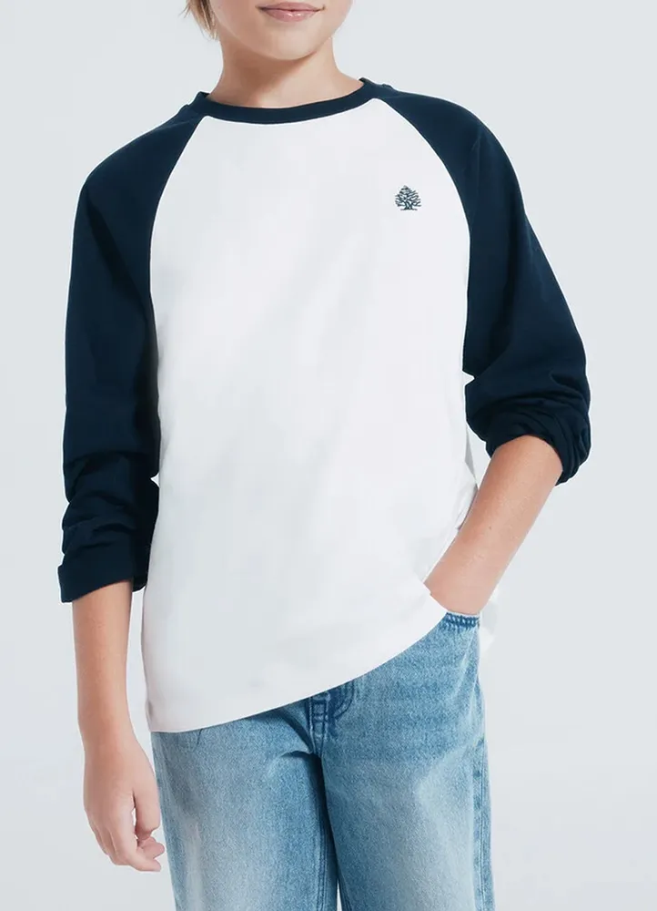 Long sleeve, crew neck t-shirt with raglan sleeves, and logo on the chest.