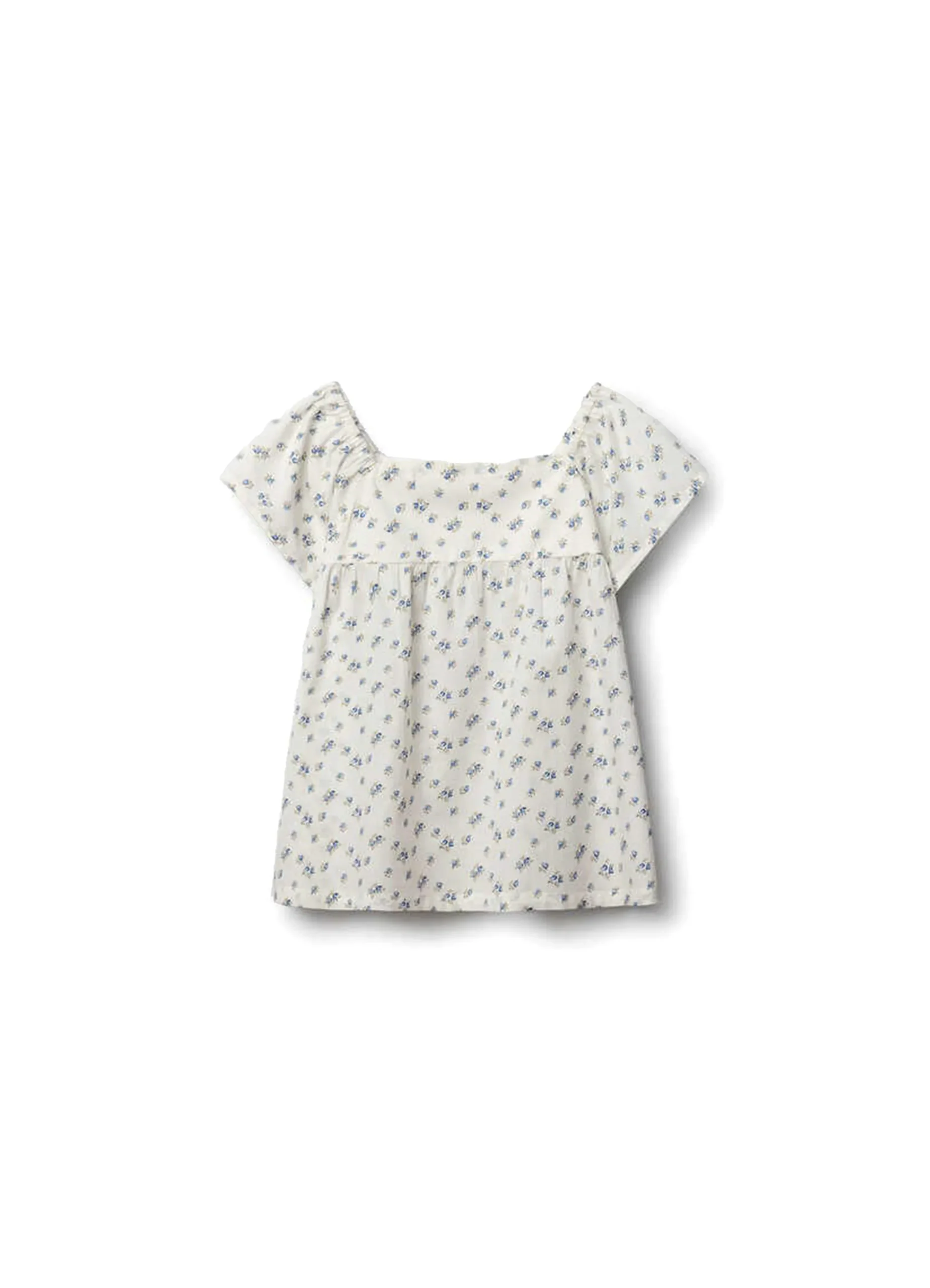 Short sleeve, square neck blouse with a flower print, and ruffled sleeves.