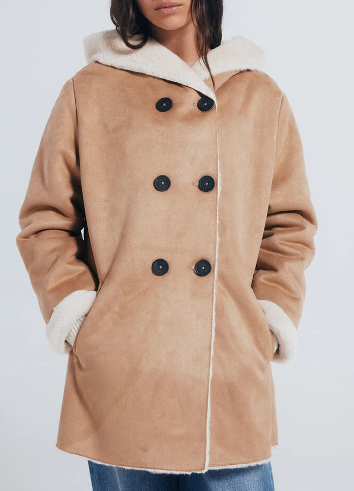 Double face, double breasted coat with hood, inner fur, and two side pockets.