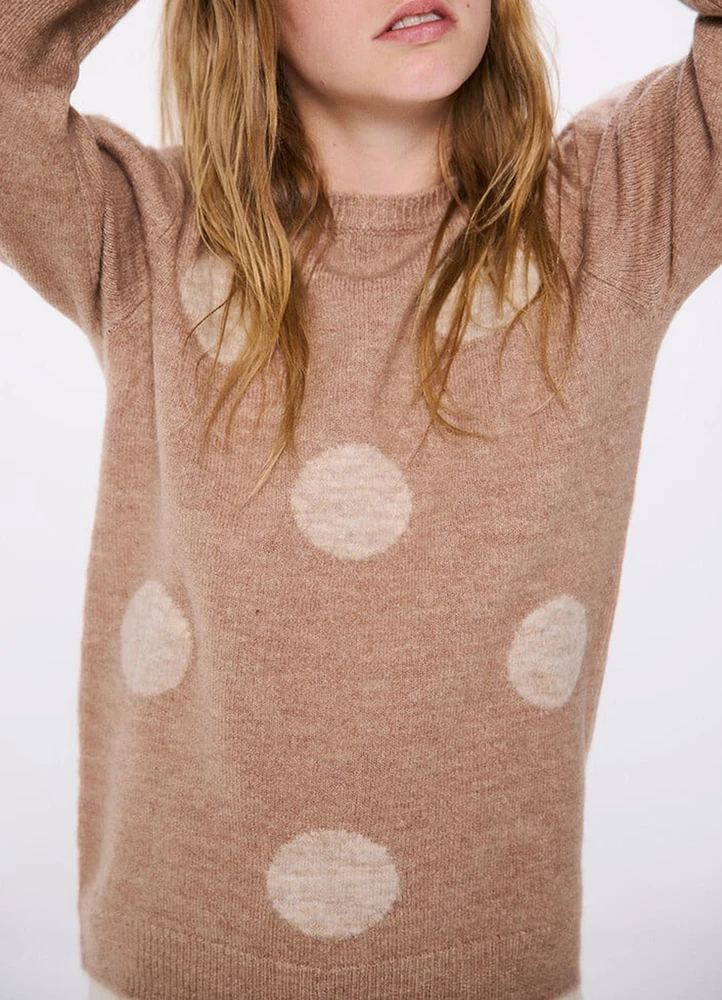Long sleeve sweatshirt for girls features a round neck, all over jacquard circles, shoulder volume, and ribbed cuffs and hem.
