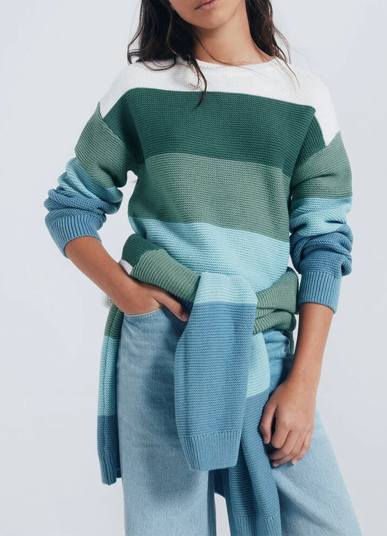 Long sleeve, crew neck sweater featuring a wide striped print, and ribbed collar, cuffs and hem.
