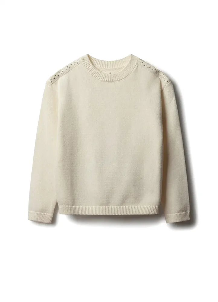 Long sleeve, crew neck sweater featuring off shoulders, stud embellishments, and ribbed endings.