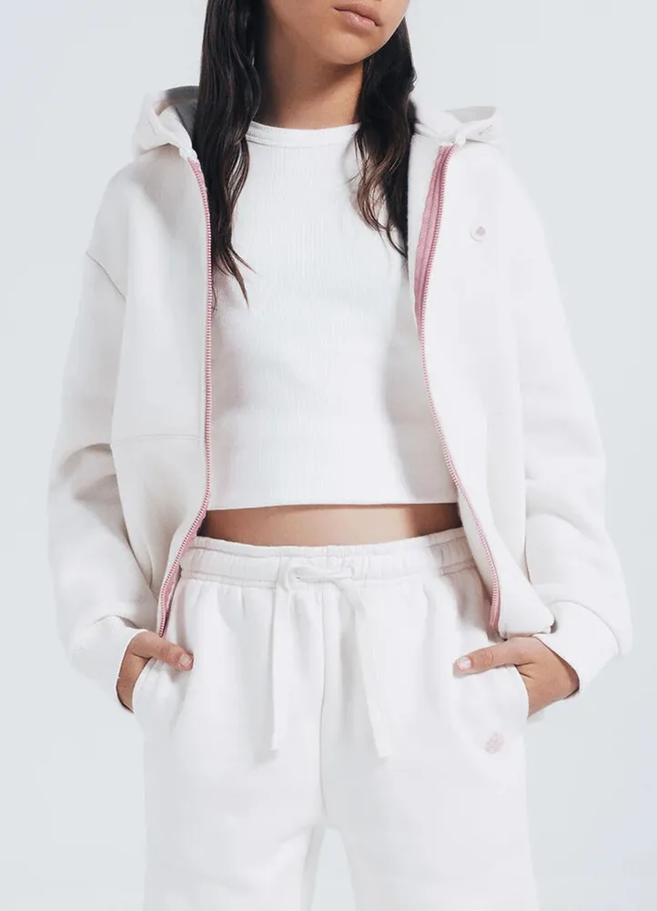 Long sleeve, hooded sweatshirt cardigan with kangaroo pocket, zip closure, and logo on the chest.