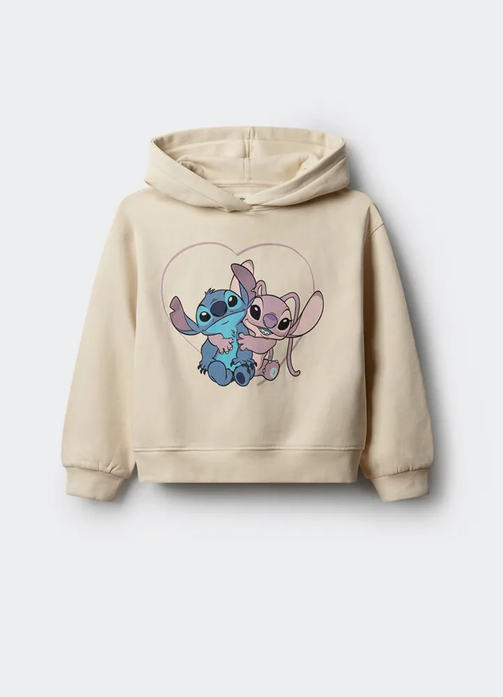 Long sleeve sweatshirt hood featuring a front Stitch motif print, and rushing at the cuffs and hem.