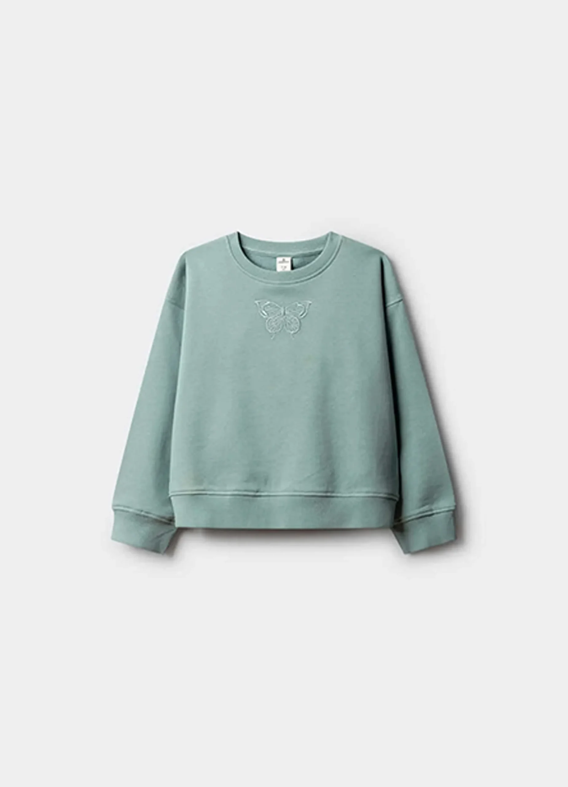 Long sleeve, crew neck sweatshirt featuring a front butterfly embroidered.