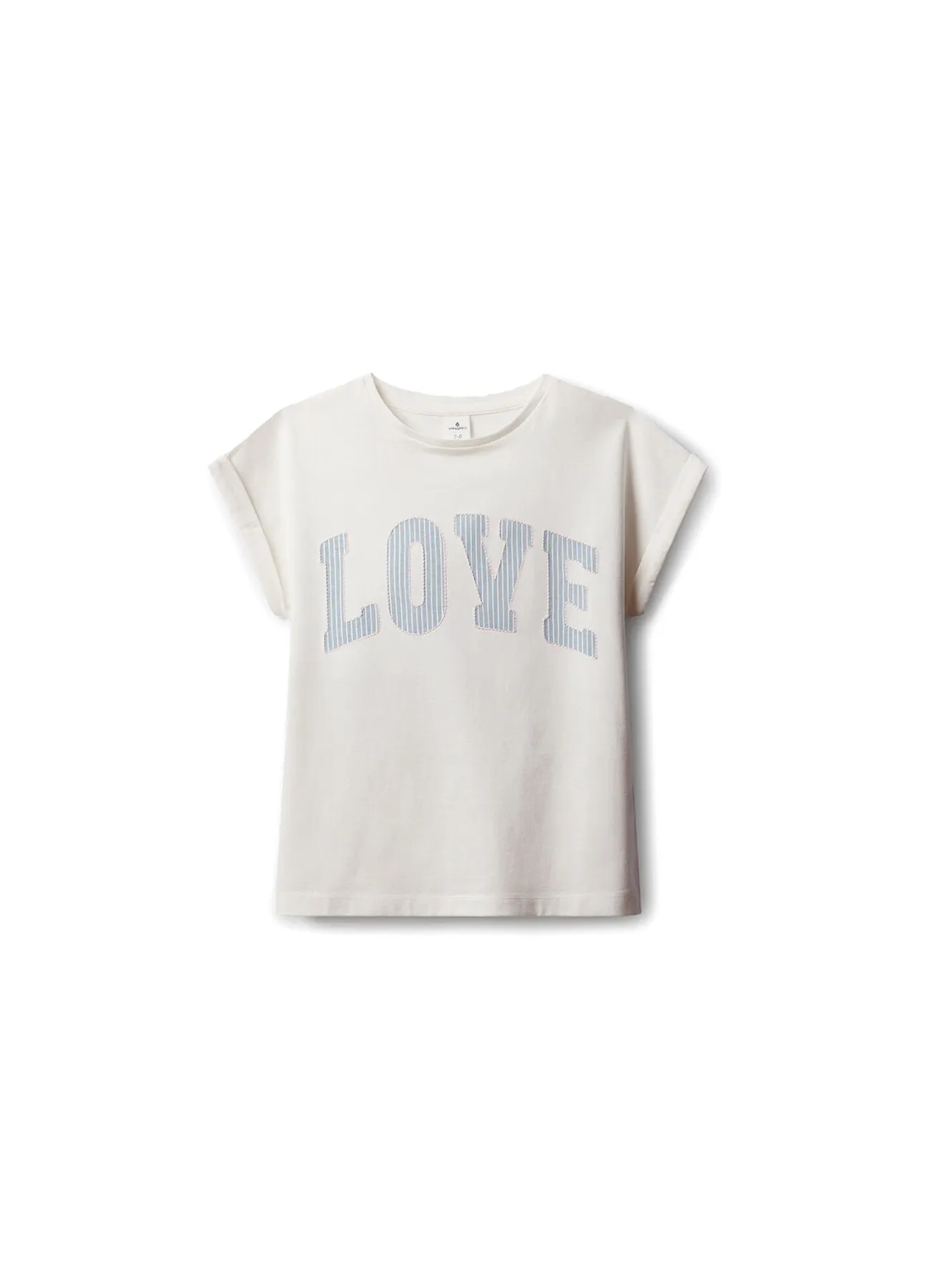 Short sleeve, crew neck t-shirt with striped embroidered LOVE text on the front.