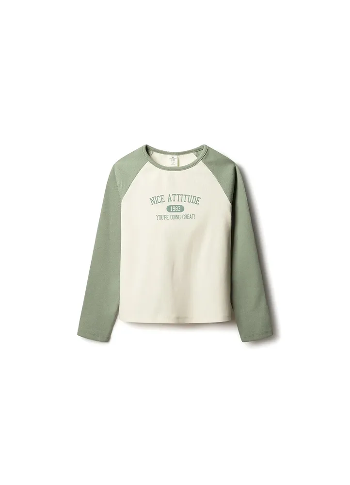 Long sleeve, crew neck, ribbed t-shirt with a contrasting raglan sleeves, and a front Nice Attitude text print.