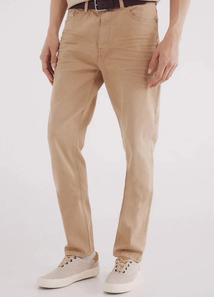 Slim fit 5-pocket stretch pants featuring a zip fly closure, fake selvedge detail on the match pocket, and a garment-dyed, used-look wash with front wrinkles.