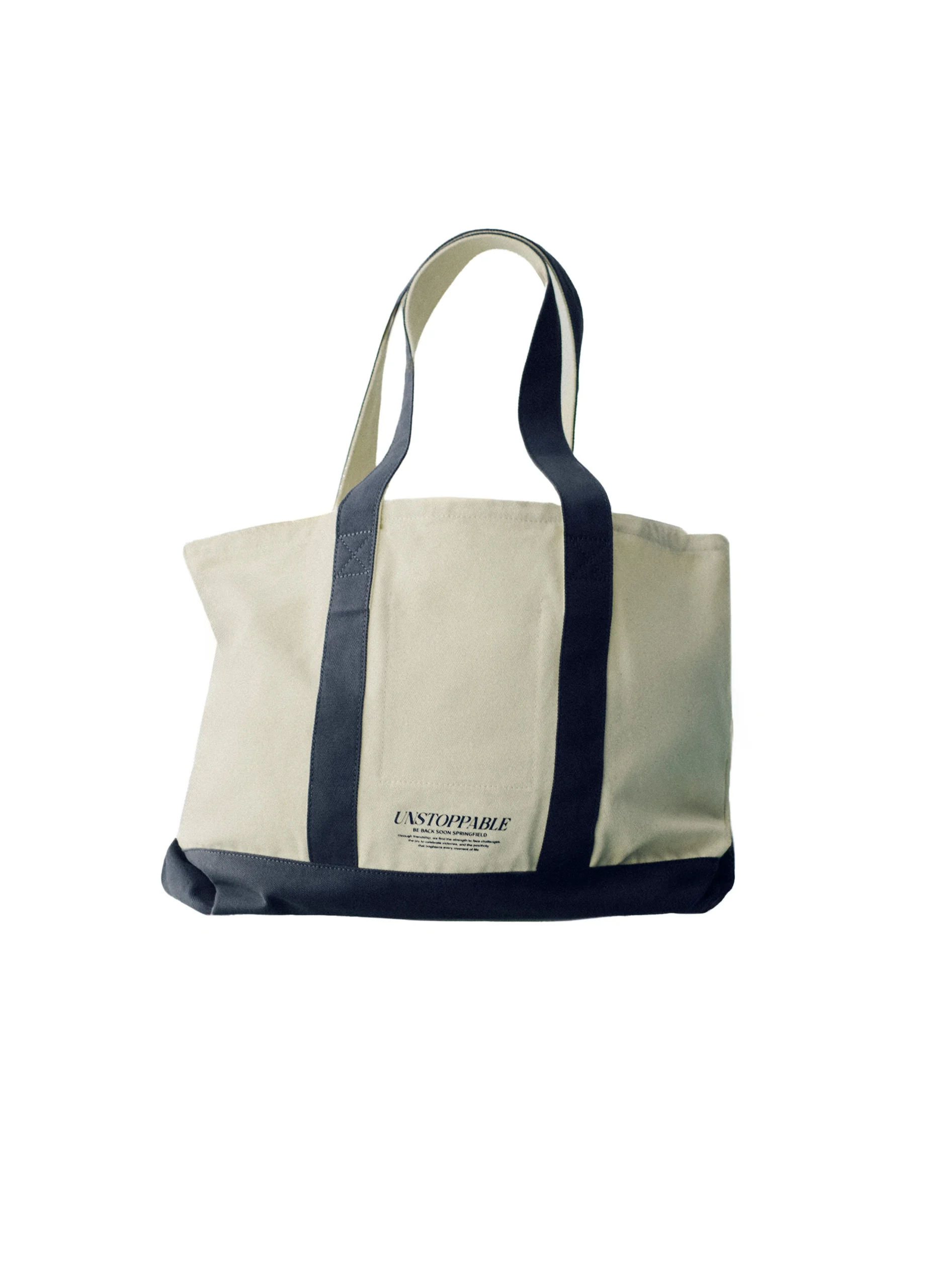 Bicolor retro shopper bag with contrasting handles, and Unstoppable text print on the front.