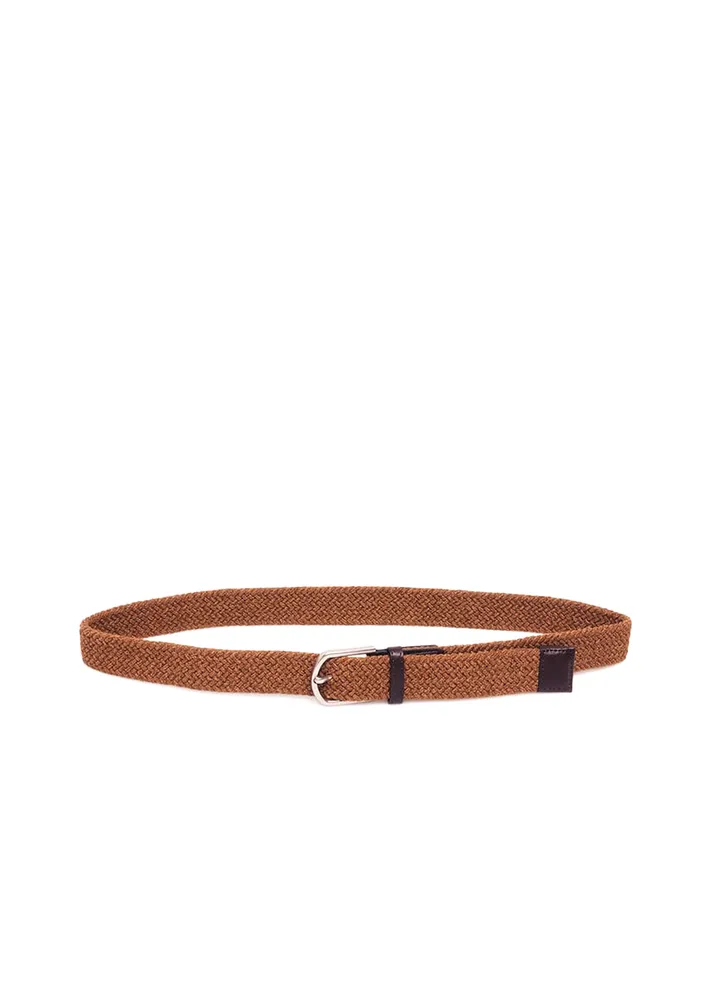 Braided fabric belt featuring faux leather accents, and an engraved logo.