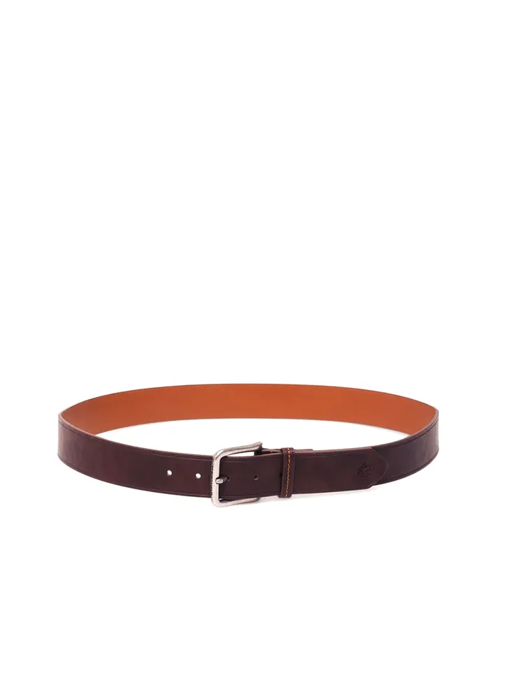 Leather effect belt featuring engraved line detailing, double stitching, and a metal buckle with logo.