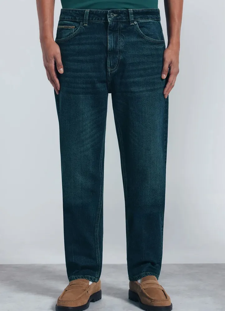 Regular fit, 5-pocket, stretch comfort jeans featuring a dark wash with a slightly dirty, vintage used look, front wrinkles, two-tone embroidery on the match pocket, and a zip fly closure.