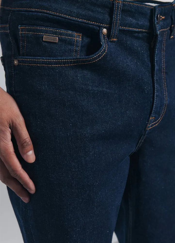 Slim fit, 5-pocket stretch jeans are crafted from lightweight denim with a clean, unglued wash, featuring a zip fly closure, and a metal plate detail in the match pocket.