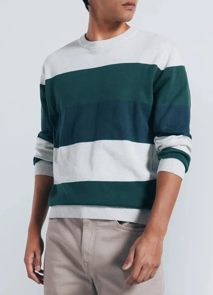 Long sleeve, crew neck, color block striped sweater featuring a ribbed collar, cuffs, and hem.
