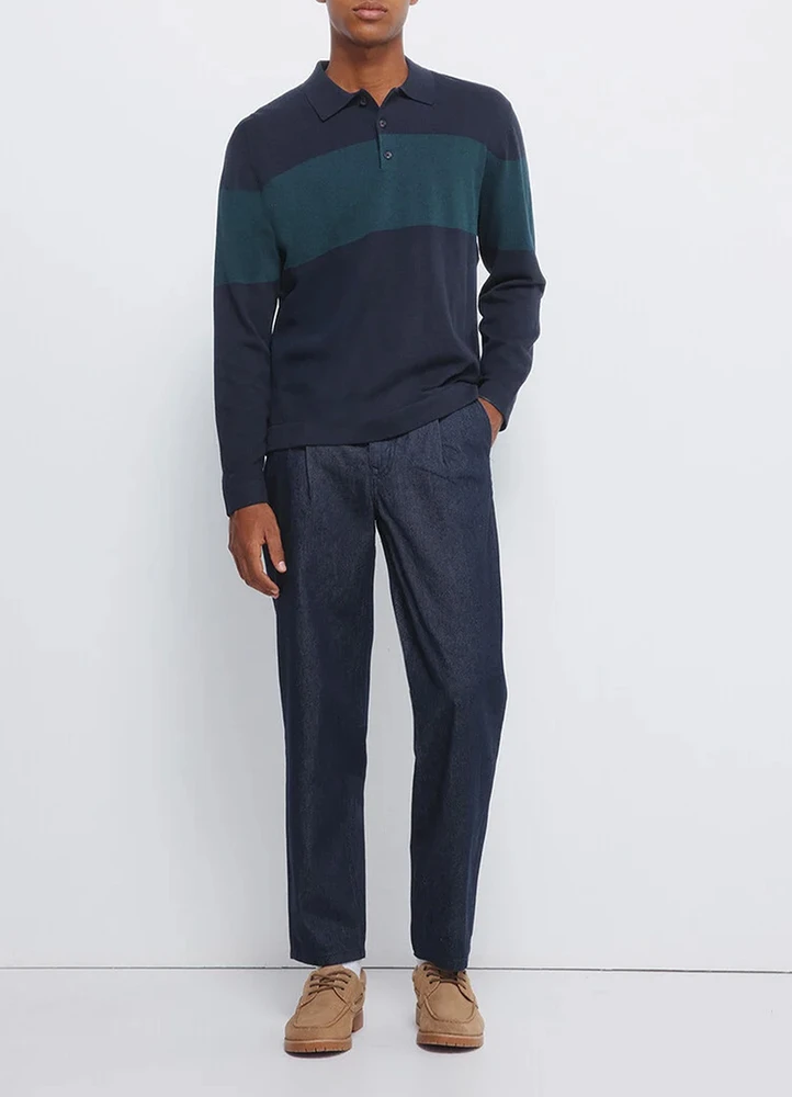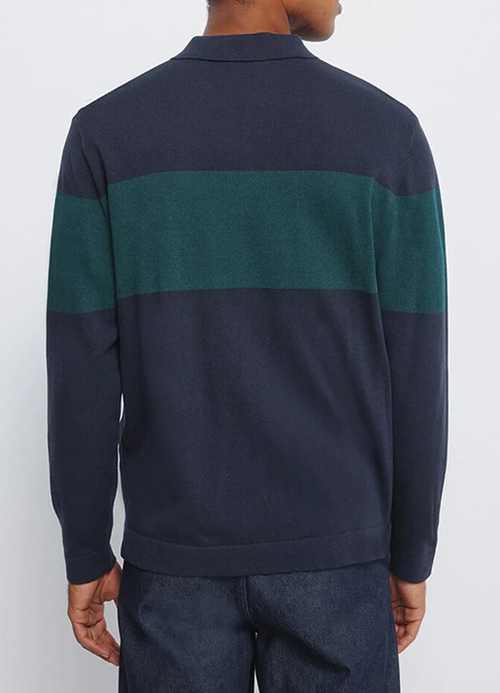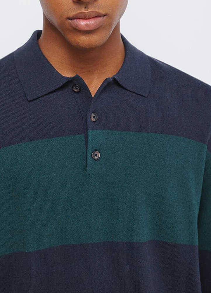Long sleeve sweater with wide horizontal stripe, a buttoned polo collar, and ribbed cuffs and hems.