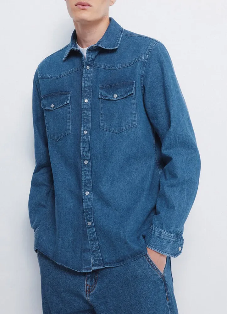 Long sleeve, regular fit, denim overshirt featuring a V-yoke, and two front pockets with snap button closure.